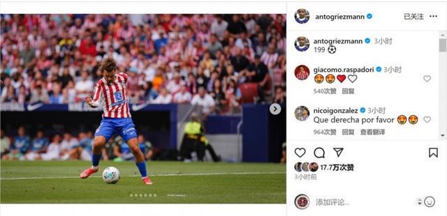 格列兹曼各赛事为马竞攻入199球,职业生涯至今在西甲比赛中打进199球,仅差1球达成200球里程碑,赛后他在社交媒体上晒出比赛照片,配文:“199⚽️”