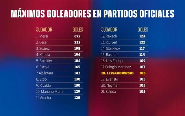 在与皇家社会的比赛中打入一球后,莱万巴萨生涯已打入105球,这使得他追平内马尔等人,升至巴萨队史射手榜第18位。