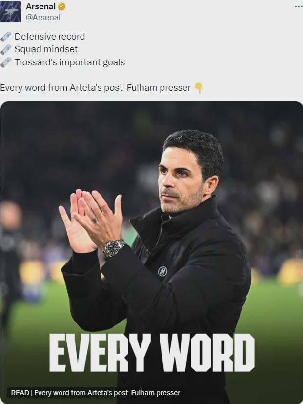 阿尔特塔出席了赛后新闻发布会,我们只看重点问题。