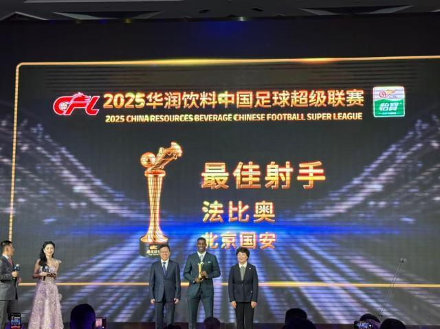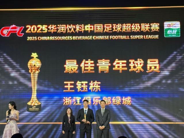12月12日晚,2025赛季中国足球职业联赛颁奖会隆重举行,各年度奖项评选结果相继揭晓。法比奥获中超最佳射手,王钰栋获中超最佳青年球员奖。