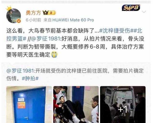根据直播吧记者的消息,初步的结果是沈梓捷骨头没事,但是韧带有撕裂,这已经是不幸中的万幸。目前为止北控男和沈梓捷团队都没有公布他具体需要休战多久,也没有公布他是否需要手术治疗的消息,从直播镜头来看伤的并不是很严重,但是有媒体人预测他会伤停6-8周的时间,至少春节前是无法上场比赛了。