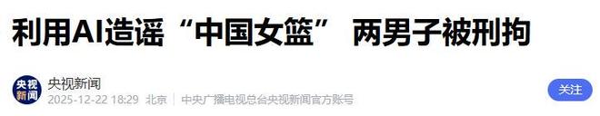 信息来源:原文登载于央视新闻2025年12月22日关于“利用AI造谣“中国女篮”两男子被刑拘”的报道