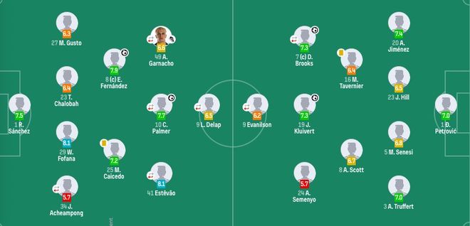 切尔西首发:1-桑切斯、34-乔什·阿昌庞(46'24-詹姆斯)、23-查洛巴、27-古斯托、29-福法纳、25-凯塞多、8-恩佐、41-埃斯特旺(92'11-吉滕斯)、10-帕尔默(63'20-若昂·佩德罗)、49-加纳乔(46'7-内托)、9-德拉普(87'17-桑托斯)