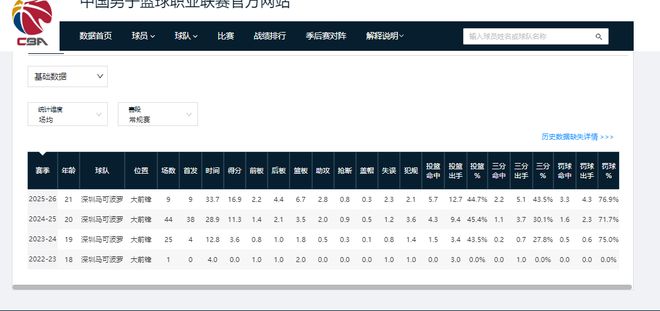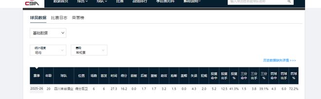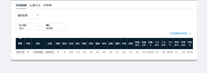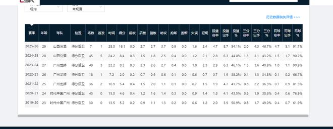 作为选秀球员,截至25-26赛季,贾明儒已累计征战CBA7个赛季。前6个赛季,他单赛季的场均出场时间就没超过9分钟,得分数也未上过双。但本赛季,贾明儒已打成山西队次主力控卫。