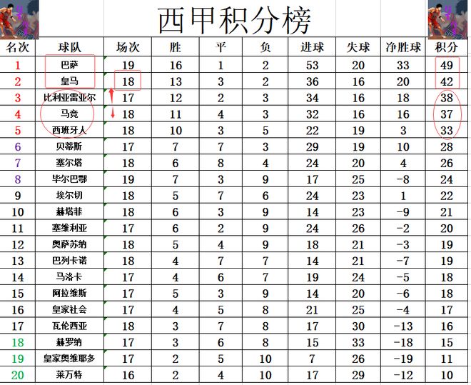 积分榜方面,巴萨先赛赢球后豪夺西甲9连胜,暂时将和皇马的差距拉大到7分,这半程冠军是相当的稳固。比利亚雷亚尔及时止住颓势,赢球后超过马竞1分重回前3。西班牙人无力在巴萨身上抢分,还是差马竞4分位列第5。