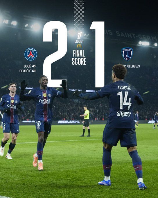 北京时间1月5日03:45,法甲联赛第17轮,巴黎圣日耳曼坐镇王子公园球场迎战巴黎FC。上半场,法比安助攻杜埃首开记录。巴黎圣日耳曼半场1-0领先巴黎FC。下半场,扎巴尔尼犯规送点,戈贝尔点射扳平,登贝莱破门。最终巴黎圣日耳曼2-1击败巴黎FC,距离榜首还有1分差距。