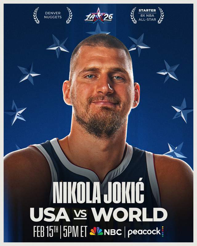 约基奇成为西部全明星首发,这是他生涯第8次入选全明星,也是连续第8年入选。赛季至今,约基奇场均29.6分12.2篮板11助攻,其中场均篮板和助攻均排名联盟第一。