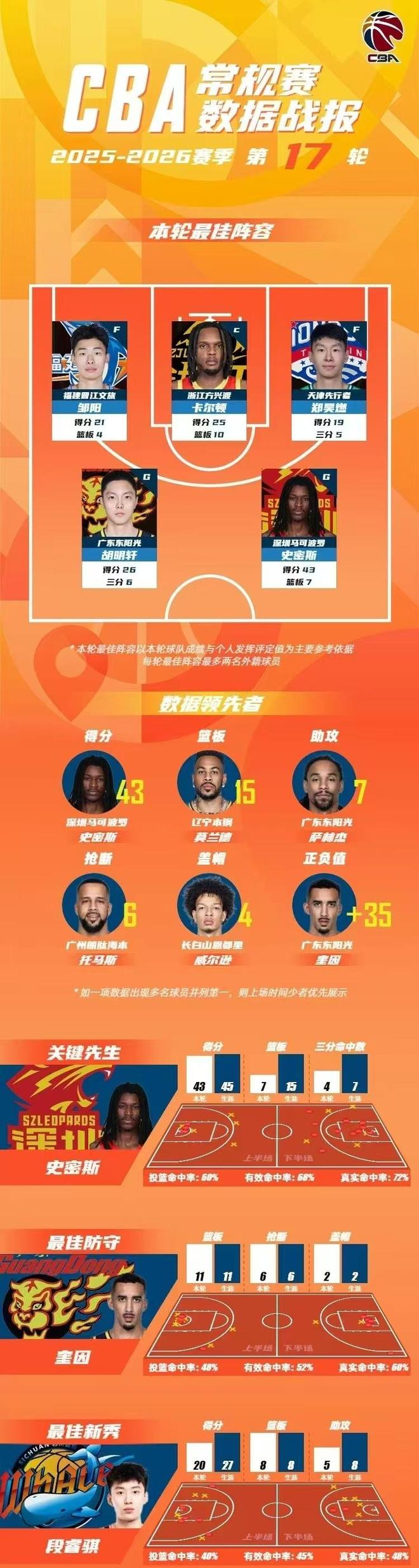 深圳球员史密斯以单场43分的数据领衔得分榜。