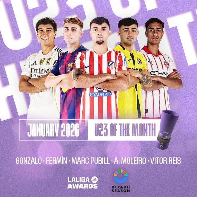北京时间1月22日,西甲1月最佳U23球员候选名单公布,这5名球员为贡萨洛-加西亚、费尔明-洛佩斯、普维尔、莫莱罗、维托尔-雷斯。